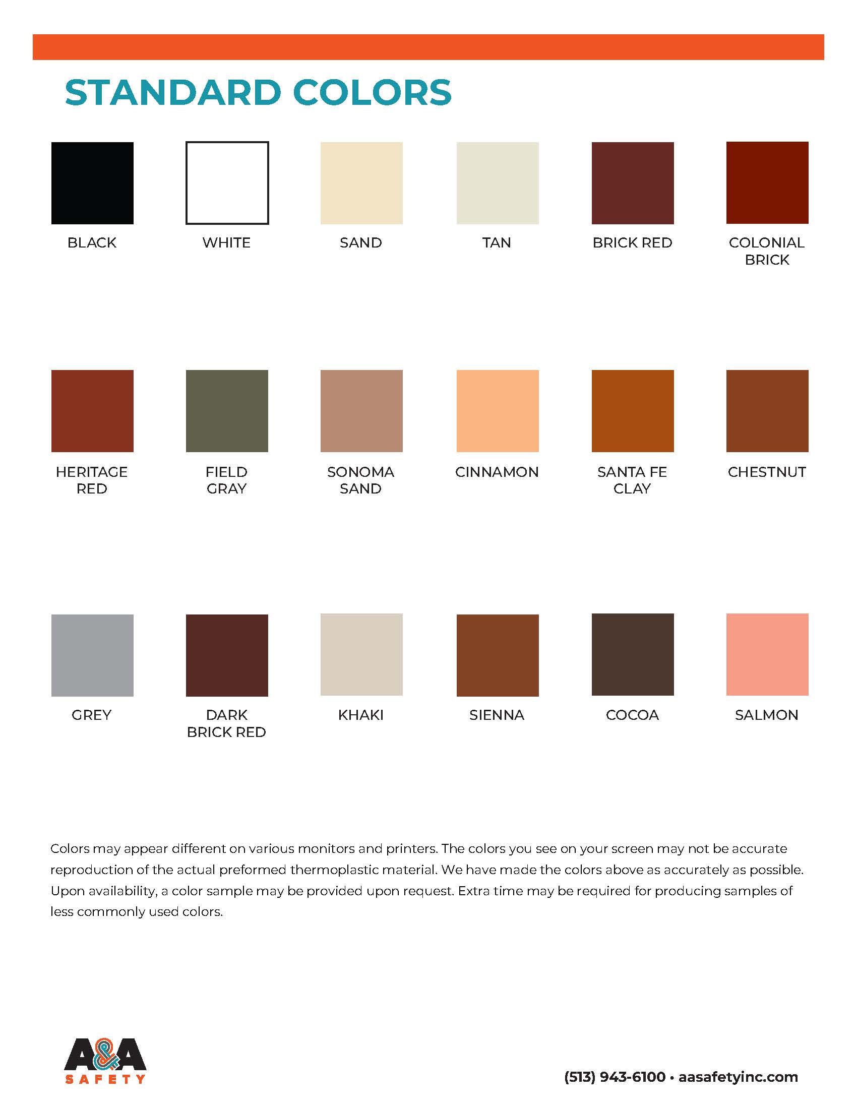 Colors range from classic reds and browns to cool grays and even bold custom hues for schools, municipalities, or branded environments. In addition to the actual crosswalks, matching thermoplastic can generally also be applies to any paved surface, such as adjacent walkways.